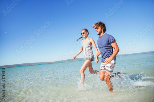 Couple running in water together