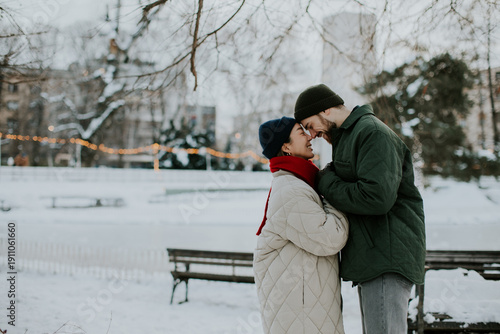 couple, winter, snow, park, tree, love, affection, joy, people, human relationships, romance, together, moment, holiday lights, cold, snowflake, happiness, sharing, connection, smile, hugs, bright, season, fun, sunrise, engagement, attraction, playful, warmth, dating, intimacy, casual attire, young, standing, scenery, friendship, bonding, leisure, togetherness, beauty, evening