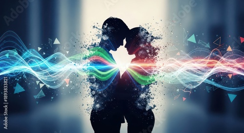 couple, silhouette, energy, wave, vibrant, geometric, shape, love, romance, together, connection, abstract, art, design, digital, illustration, graphic, pattern, background, texture, colourful, bright, light, emotional, intimate, human relationships, people, human, form, outline, profile, togetherness, bond, oneness, harmony, sync, alignment, fusion, merge, join, link, kiss, hugs, hug, warmth, tenderness, soft, sharpened, spotlight