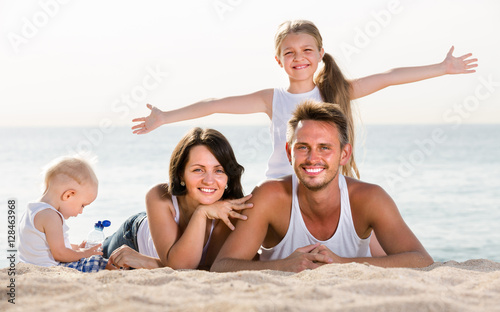 family, beach, woman, man, couple, children, children, lying, leaning, sea, sand, umbrella, embracing, hugging, shadow, relaxed, resting, smiling, cheerful, boy, girl, sibling, toddler, laughing, outdoors, vacation, holiday, summer, seasonal, leisure, caucasian, european, 30s, glad, spade, joy, ocean, together, son, daughter, fun, sunlight, emotion, coastline