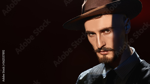 man, gentleman, business, detective, brutal, adult, american, brown, businessman, caucasian, classic, closeup, confident, copy space, costume, courageous, criminal, dark, face, fashion, finance, gangster, photogenic, hat, indoor, italian, lifestyle, light, luxury, mafia, male, masculine, motion picture, moustache, people, portrait, retro, rich, serious, shade, shirt, strong, style, suit, vest, wealth, well-dressed, western