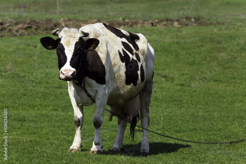 Cow on a grass background in the Ukrainian village