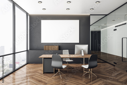 modern, office, interior, classic, design, concrete, desktop, desk, table, chair, equipment, computer, monitor, wall, keyboard, three-dimensional, rendering, loft, real, estate, architecture, room, inside, luxury, contemporary, floor, background, nobody, corporate, business, furniture, workplace, workspace, elegance, clean, copy space, decorative, sideview, side, view, window, city, daylight, render, poster, banner, billboard, blank