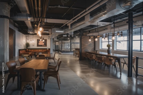 co-working space with industrial decor, exposed piping and metal accents, created with generative ai