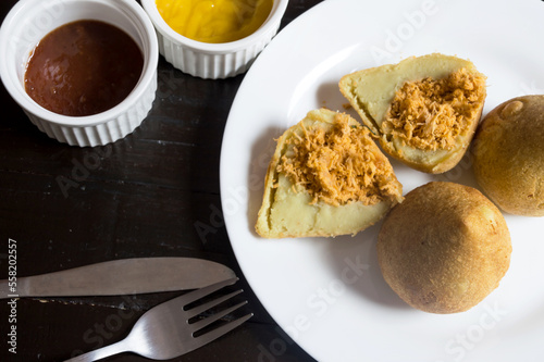 brazil, chicken, delicacy, dumpling, fried, ketchup, mustard, pasta, salty, sauce, shredded, snack, stuffing, typical