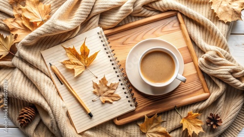 Cozy Autumn Afternoon Warm Beverage, Blank Notebook, and Dried Leaves on Wooden Tray