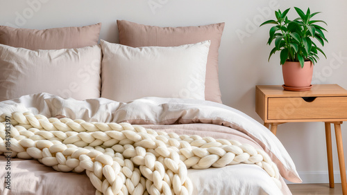 cosy, blanket, knitted, braiding, bed, home, decor, interior, scandinavian, minimalism, neutral, beige, pink, textile, pillow, nightstand, plant, pot, bright, soft, comfort, nordic, bedchamber, style, closeup