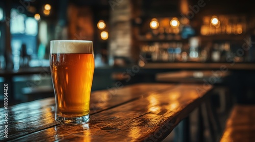 Cozy beer pub interior with wooden tables and dim lighting glasses of beer on the bar counter rustic decor and warm atmosphere
