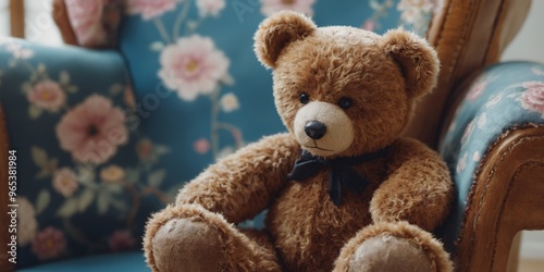 Cozy Brown Teddy Bear on Floral Armchair in Blue Upholstery, Liv