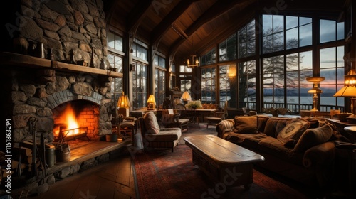 fireplace, cabin, lake, sunset, cosy, interior, home, warm, fire, wood, stone, window, view, evening, relaxation, comfort, rustic, filed, furniture, sofa, lamp, room, house, design, architecture, living, area, twilight, serene, peaceful, tranquil, calm, comforting, inviting, homely, natural, elegant, refined, mountain