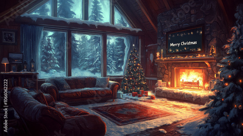 Cozy cabin interior with a fireplace, Christmas tree, and snowy view. Concept of holiday warmth and comfort.