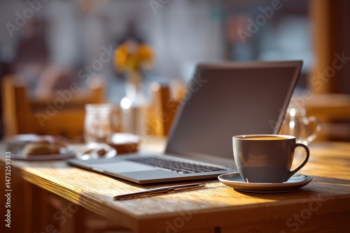 cafes, workspace, laptop, coffee cup, cosy, wooden table, notebook, pen, productive, relaxing, morning, interior, breakfast, working environment, digital, technology, contemporary, urban, home office, sunlight, calm, focused, modern, soft light, peaceful, conversation, decor