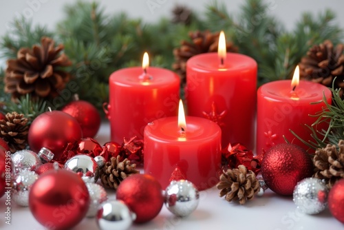 candle, christmas, festive, red, glow, decoration, silver, bauble, pine cone, greenery, cosy, atmosphere, holiday, season, lit, warm, surrounding, celebratory, arrangement, setting, typical, tree, ornament, lighting, adorned