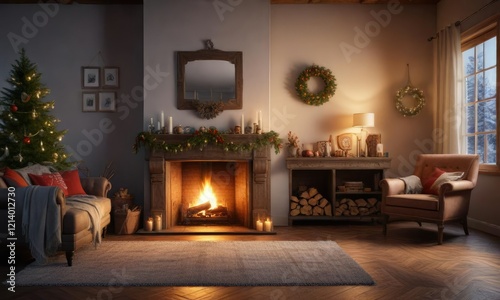 Cozy Christmas Eve living room with decorated fireplace, warm, christmas eve