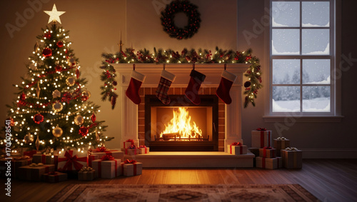 Cozy Christmas Fireplace, Tree, Gifts and Stockings Festive Home Interior