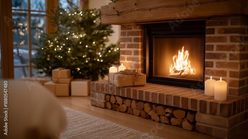 Cozy Christmas interior with glowing tree lights, warm fireplace with burning logs, wrapped gifts and flickering candles, capturing timeless holiday warmth and peaceful celebration. cinematic color