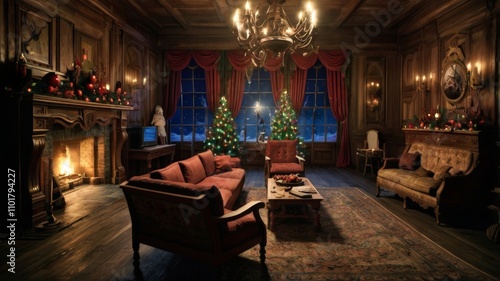 christmas, living room, fireplace, tree, decoration, cosy, holiday, home, interior, warm, festive, light, candle, chaplet, gift, winter, celebration, family, comfort, tradition, ornament, garland, stocking, present, armchair, couch, table, window, snow, evening, glow, star, ribbon, pine, crackling, hearth, mantel, cushion, rug, snug, gathering, room, wood, design, architecture, inside, indoor, table, hall