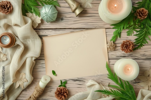 Cozy Christmas mockup top view with kraft paper on wooden table, burning candle, fir branches, warm beige knitted sweater, pine cones, cinnamon, and cloves. Christmas aesthetics. Flat lay.
