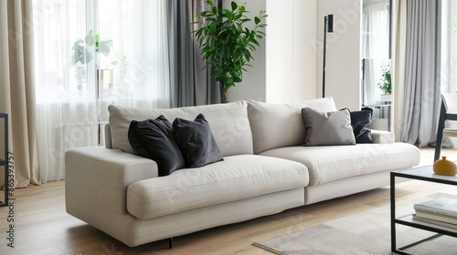 cozy couch sofa in living room interior design, minimalistic modern interior
