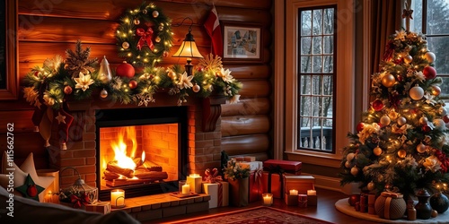 Cozy fireplace adorned with Christmas tree and festive decorations, cozy atmosphere, winter