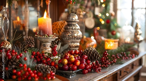 candle, holly, ornament, pine, chaplet, seasonal, festive, christmas, holiday, winter, cosy, rustic, charme, traditional, hand-made, natural, still life, arrangement, interior, gourd, pine cone, berry, vintage, elegant, warm, glow, fireplace, window, table, shelf
