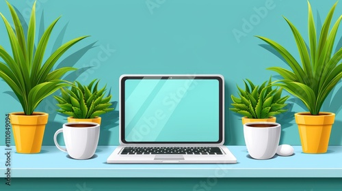 Cozy home office setup featuring a laptop and coffee mugs by houseplants