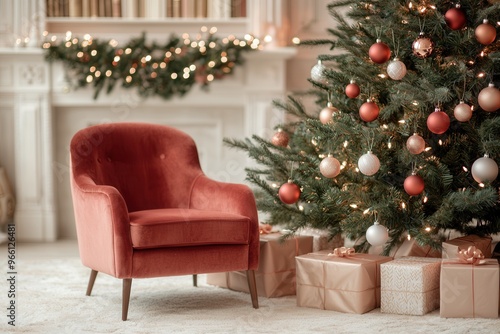 Cozy living room scene featuring a festive Christmas tree and stylish armchair adorned with beautiful decorations.