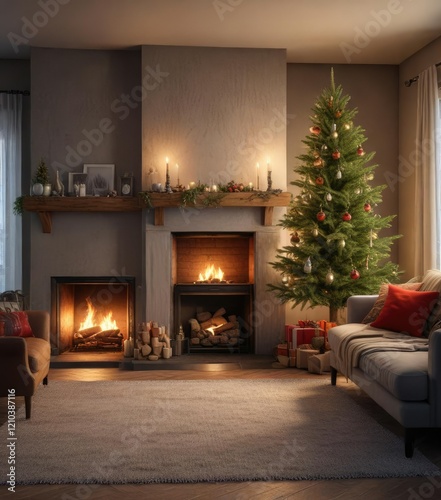 Cozy living room with a fireplace and Christmas tree, fireplace, cozy living room, holiday decorations