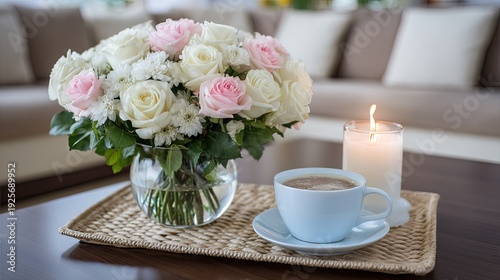 living room, rose, hot drink, candle, evening, spring, summer, cosy, flower, vase, warm light, interior design, relaxation, comfort, decorative, lifestyle, modern, home, decor, floral, aromatic, beverage, coffee cup, white rose, pink rose, atmosphere, calmness, stylish, design, arrangement, table setting, warm tones, indoor, leisure time