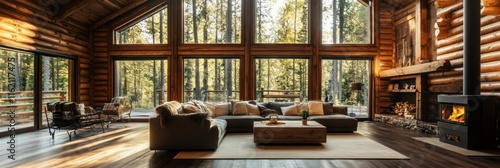 cabin, log, wood, forest, tree, living, room, sofa, couch, sectional, pillow, cushion, hot drink, table, rug, carpet, fireplace, fire, stove, warm, sunlight, window, glasses, view, nature, comfortable, rustic, interior, design, home, decor, style, tranquil, peaceful, relaxing, inviting, cosy, modern, elegant, hearth, mantle, blanket, chair