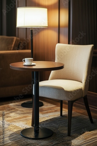 lounge, setting, hot drink, cup, lamp, chair, table, cosy, room, interior, design, modern, elegant, comfortable, warm, lighting, wood, dark, brown, beige, floor, carpet, rug, texture, style, home, hotel, atmosphere, relaxing, quiet, peaceful, inviting, sophisticated, furniture, side, small, round, footed, fabric, cushion