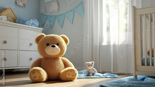 Cozy nursery scene featuring a brown teddy bear on a wooden floor surrounded by a white dresser, small stuffed animal, blue blanket, and decorative banner.