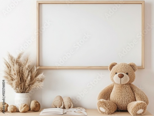 Cozy nursery scene featuring a teddy bear, decorative vase, and a blank frame, perfect for children's room or home decor.
