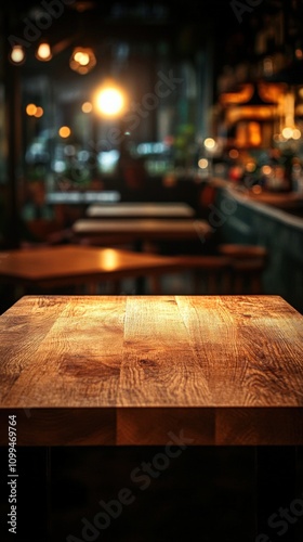 Cozy Restaurant Atmosphere with Warm Wooden Table and Soft Lighting