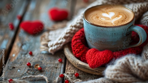 hot drink, cup, nubes, warm, cosy, romantic, morning, gesture, love, concept, red, foulard, knit up, wooden, table, texture, closeup, winter, seasonal, card, note, copy, space, relaxation, comfort, affection, lifestyle, atmosphere, cosiness, arrangement, composition, intimacy
