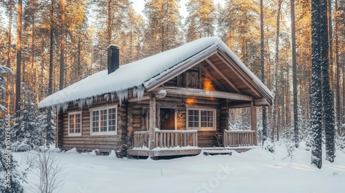 Cozy Scandinavian cabin, wooden walls, snow-covered roof, nordic minimalist design, forest backdrop