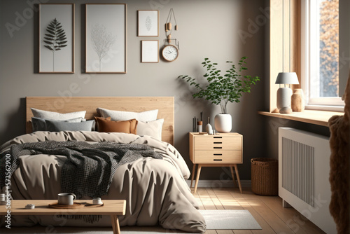 cozy scandinavian style bedroom with natural wood furniture, Generative AI