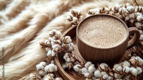 Cozy scene featuring a wooden cup of frothy beverage surrounded by cotton flowers