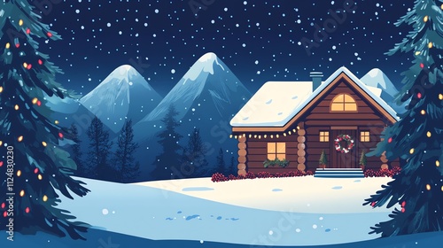 Cozy Snow-Covered Cabin in Winter Wonderland with Mountains and Pine Trees