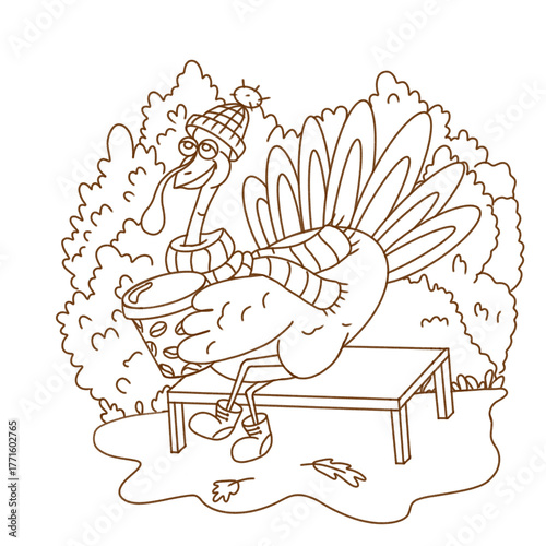 thanksgiving, turkey, hot drink, thankful, grateful, cosy, autumn, fall, foulard, hat, bench, line art, outline, monochrome, black-and-white, illustration, drawing, craft, simple, bird, relaxed, holiday, fowl, animal, funny, happy, fun, animal, colouring, comic, children, design, book, vignetting