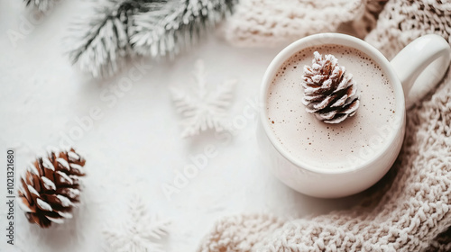 Cozy Warm Winter Drink Featuring a Pine Cone on Top, Accompanied by a Soft Warm Blanket