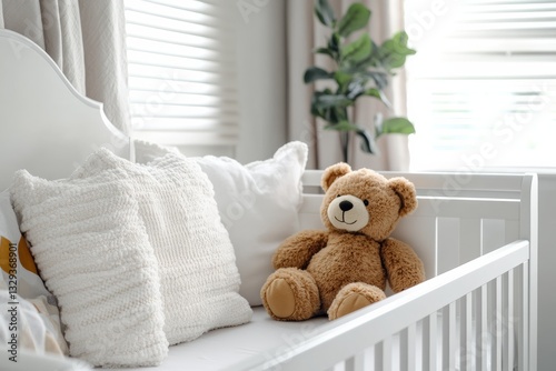Cozy white crib decorated with a teddy bear in a sunny nursery filled with soft light