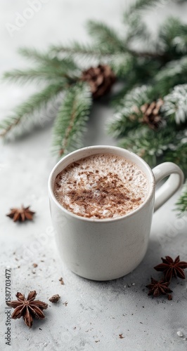 drink, hot drink, hot, cocoa, winter, warm, mug, white, festive, christmas, spiced, cinnamon, star anise, pine, cone, nature, cosy, comfort, delicious, sweet, creamy, frothy, warmth, holiday, simple, elegant, background, light, grey, stone, surface, texture, aromatic, spice, closeup, still life, photo, food, beverage, morning, afternoon, relaxation, home, atmosphere