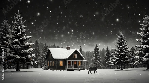 winter, snow, house, tree, cabin, cervid, forest, night, holiday, landscape, cosy, serene, nature, wildlife, season, outdoors, snowfall, country, calmness, rustic, environment, peaceful, scenery, snowy, cold, weather, sky, bright, light, warmth, wood, rural, tranquil, evening, atmosphere, frost, pine, ornament, simplicity, beautiful, scene, calm, chilly, decoration, view, starry, christmas