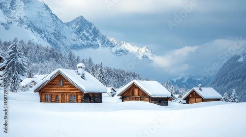 Cozy winter village nestled among snow-covered mountains with rustic wooden cottages surrounded by trees during a serene day