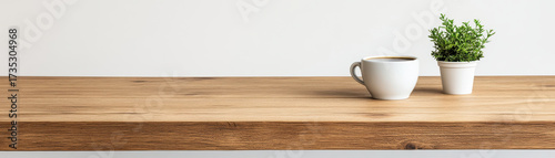 Cozy wooden table with cup of coffee and small green plant in white pot creating calm and inviting atmosphere