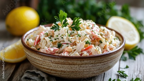 Crab meat served in a bowl with parsley and a lemon garnish.