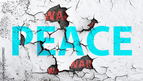 Cracked white paint with the word PEACE peeling off reveals fragments of the words WAR beneath — a stark visual metaphor for rising global conflict and the illusion of peace.