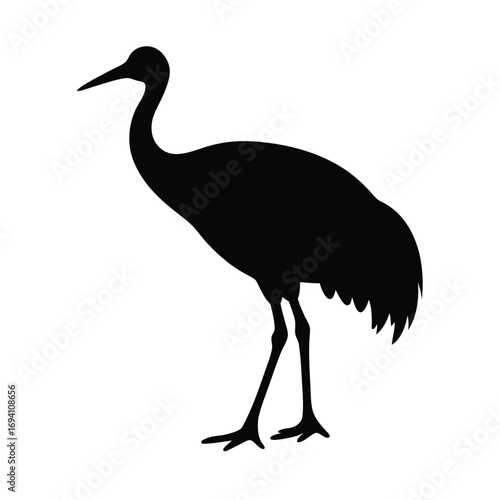 crane, bird, silhouette, vector, illustration, standing, black, white, design, style, animal, wildlife, nature, avian, long neck, leg, isolated, graphic, symbol, icon, outline, shape, drawing, art, clip art, image, wild, elegant, graceful, simple, minimalist, monochrome, ornithology, fauna, creature, element, artwork, decorative, pattern, background, template, print, tattoo, stencil, cut-out, gracefully