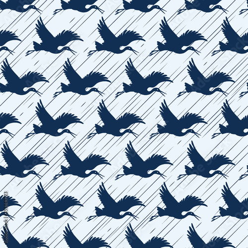 Crane Birds Flying in the Rain Vector Seamless Pattern